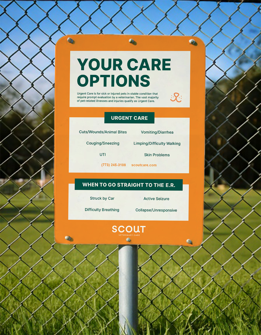 I designed a series of informational posters for Scout Veterinary Care that were displayed at a community dog park event. Working from a provided concept, I focused on creating a clear, approachable layout that allowed attendees to quickly absorb important information along with safety tips for the park. With a tight timeline and a large amount of content to condense, the design prioritized strong visual hierarchy and concise sections so the information could be easily understood at a glance while still supporting Scout’s marketing presence at the event.